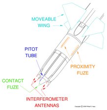 Four homing guidance antennas were located around the nose of the missile. These antennas were made of fairly fragile ceramic, and were protected by covers made of low melting temperature metals. Friction with the air during flight generated heat that melted the covers and exposed the antennas. The four antennas functioned as an interferometer to determine the angle to the target. The continuous wave homing signal that was sent by the ship reflected off the target. When the missile began closing the target the signal was detected by the homing antennas. Antennas on opposite sides of the missile were paired, and each pair was associated with the controls for a pair of moveable wings, also on opposite sides of the missile. The missile's electronics determined the time difference between when a signal arrived at the two antennas in a pair. If the missile was headed for a collision with the target the time difference would not change - the relative bearing from the missile to the target was constant. If the time difference changed the electronics would turn the wings associated with the antenna pair to bring the time difference back to the original, steering the missile back on a collision course. Using the time difference signals from the two pairs of antennas the missile steered a constant bearing, decreasing range trajectory that would lead to a collision with the target. If the target maneuvered the missile changed course to follow the reflected signal. This was a fairly simple system that could be built with the vacuum tube electronics common in the 1940s and 1950s, but it provided an effective means of guiding the missile to the target.