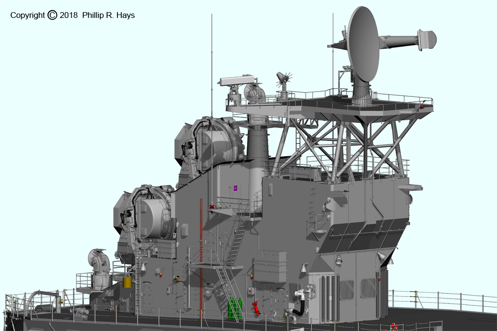 Forward Air Control was located on the O5 deck above the O4 level deckhouse, just forward of the Mk 37 director barbette. The station was a carryover from World War II antiaircraft duels with attacking planes and Kamikazes. It had two Target Designation Transmitters (TDTs) to be used to give bearing and elevation of approaching aircraft and communications and switching arrangements to assign targets to the Mk 37 director or the 5"/37 gun mount. By the 1970s it was an appendix of little use against supersonic aircraft and missiles. This was one of the least photographed parts of the ship. People took pictures from the O5 level, but rarely of the O5 Forward Air Control station. It was one of the most difficult parts to model.