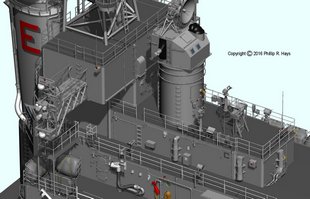 The missile house is the simplest of the deck houses, but it still has a lot of details. The starboard warhead davit on the top of the missile house is shown in the stowed position and the port davit is raised for warhead transfer.