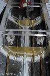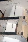 All surfaces were sanded to create a rough surface for the glue to adhere to. Everything was cleaned with acetone, then with water and dishwasher detergent, and then they were thoroughly rinsed to remove the soap. This procedure removed oils and water soluble contaminants. Absolute cleanliness is necessary to get a good glue bond. A long strip of 1" x 1/4" plexiglass was glued in place inside the hull along the keel from frame 21 to frame 115. I used "SuperMend Epoxy Paste" to glue the plexiglass to the fiberglass. I have had good luck with this product and it cleans up easily with rubbing alcohol. The hull frames were notched to fit over this inner keel - this prevents them from moving out of alignment while the glue is setting. I used a 1/16" drill to cut shallow "dimples" into the plexiglass on the surfaces to be glued. Then the frames were glued in place, using clamps to hold them in position inside the hull. When applying the epoxy I first flowed the glue into the dimples and then filled out the joints. After the epoxy hardens the dimples give extra strength to the joints. You can see these dimples in the photographs. I used a lot of epoxy! The hull was clamped tightly between the frames and the wooden templates until the epoxy cured.